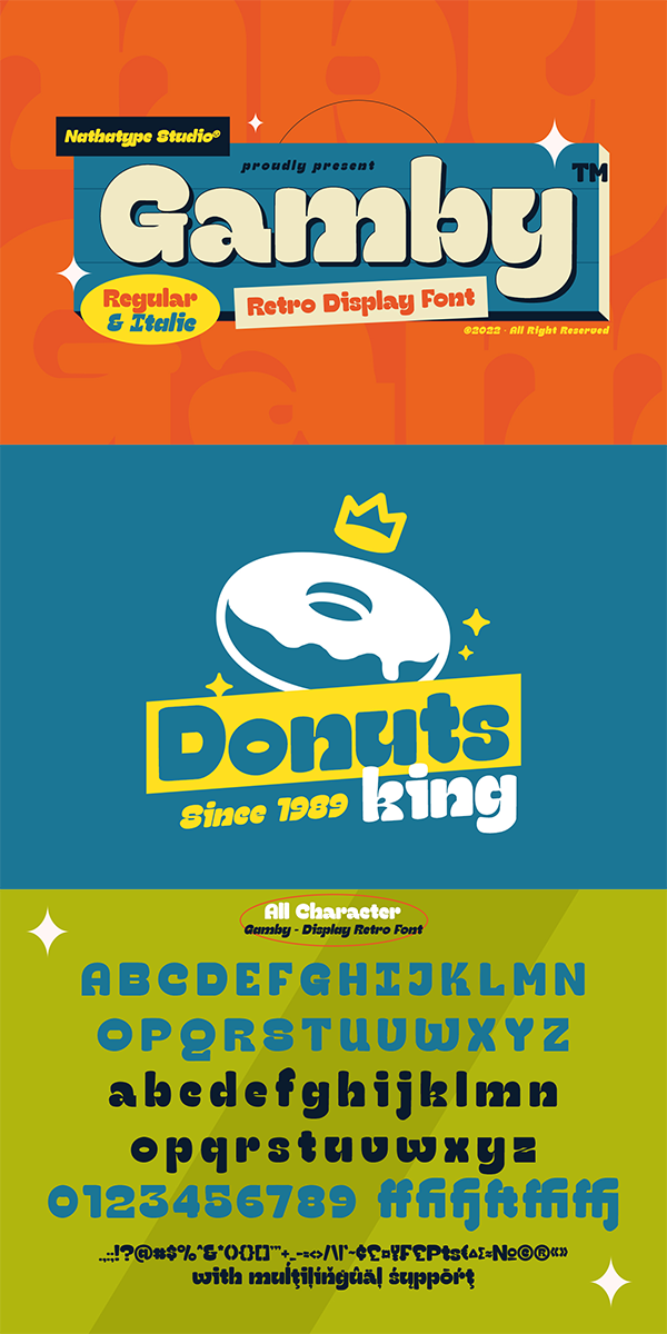 Gamby is an attractive, vintage, playful display font for your customers. Its main character is the round, thick letters in thin outlines. Gamby provides two versions, regular and italic to use for bigger-sized texts to be legible.