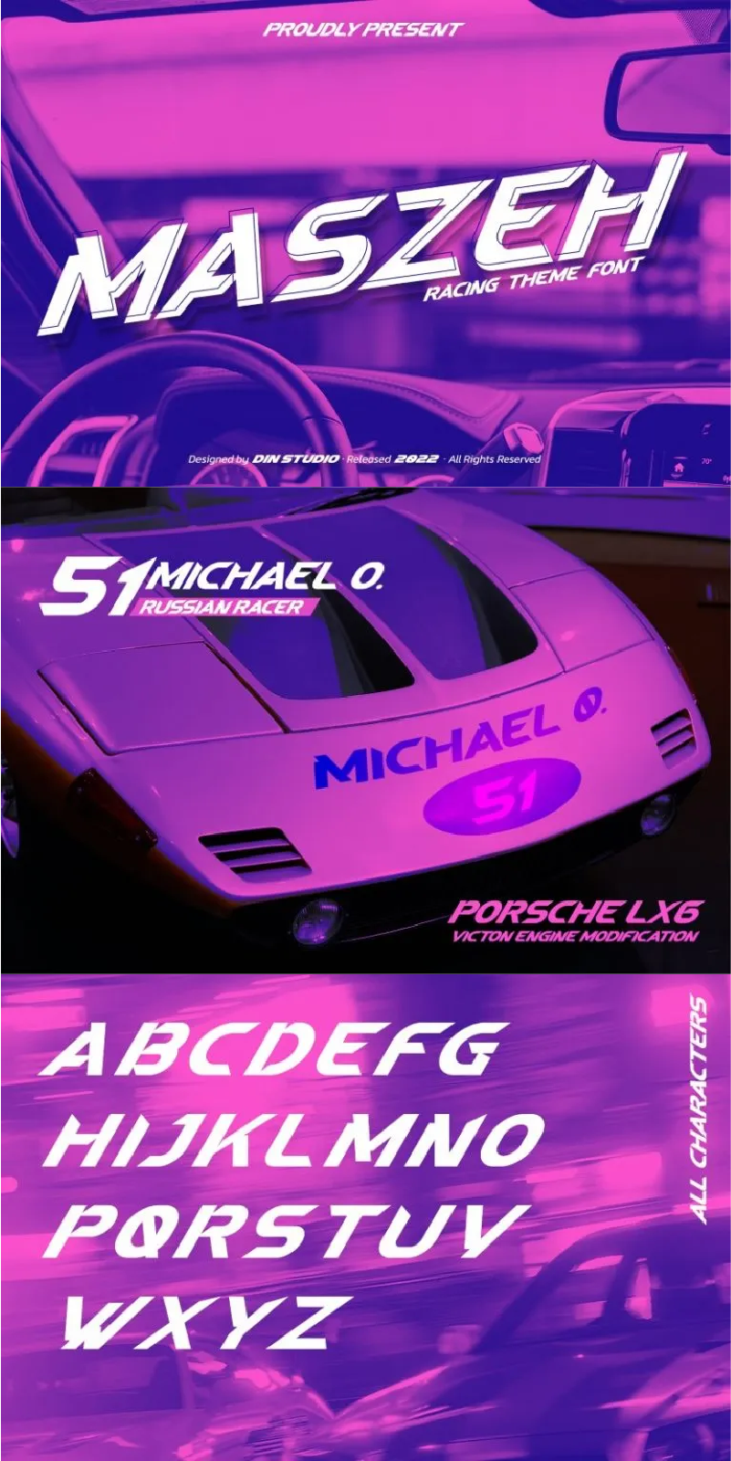 It’s time to see our impressive font, Maszeh. It is a firm font to escalate your design level higher. In line with the racing theme, this font creates brave strong impressions on your designs and is aimed to be used in any larger-sized texts such as titles than the body texts.