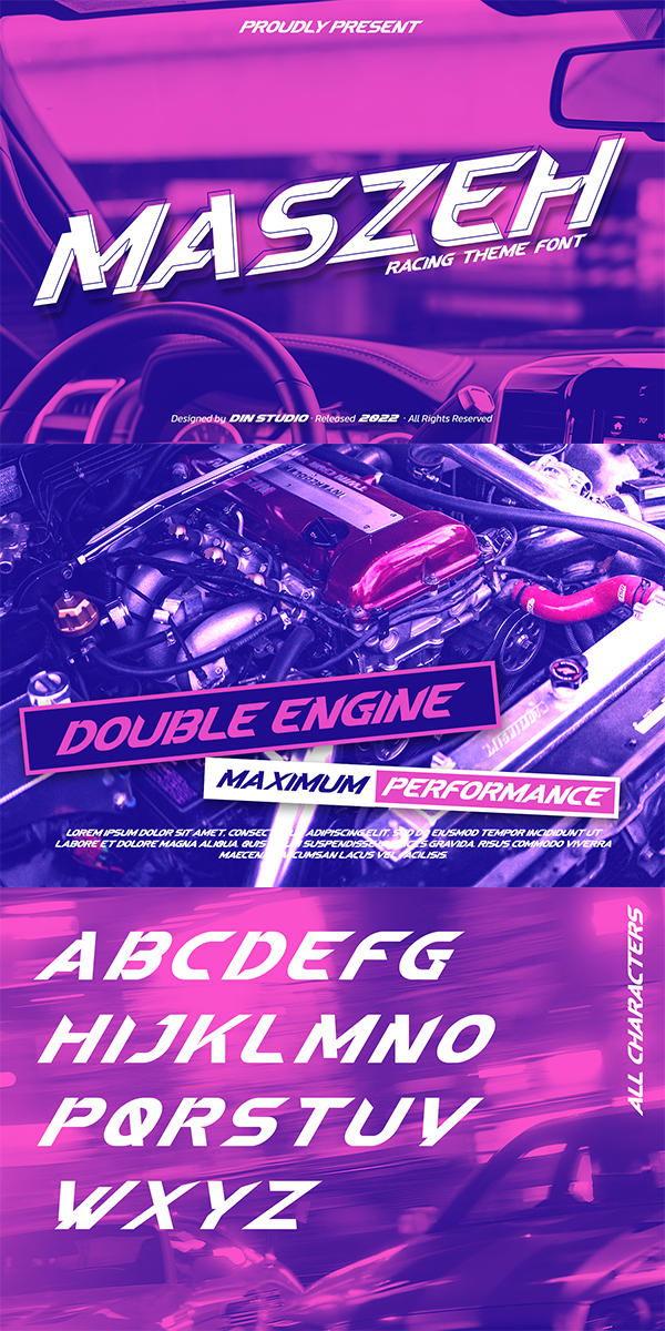 It’s time to see our impressive font, Maszeh. It is a firm font to escalate your design level higher. In line with the racing theme, this font creates brave strong impressions on your designs and is aimed to be used in any larger-sized texts such as titles than the body texts. Enjoy other incredible features available on this font.
