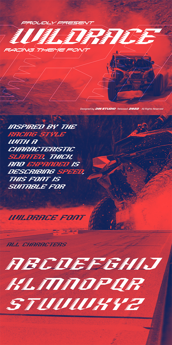 Wildrace is a display font created in capital letters with the racing theme. The font’s character is the thick letters formed similar to rectangles to give strong impressions. Therefore, it will be more noticeable and match the large-sized texts. Wildrace also provides interesting features to enjoy.