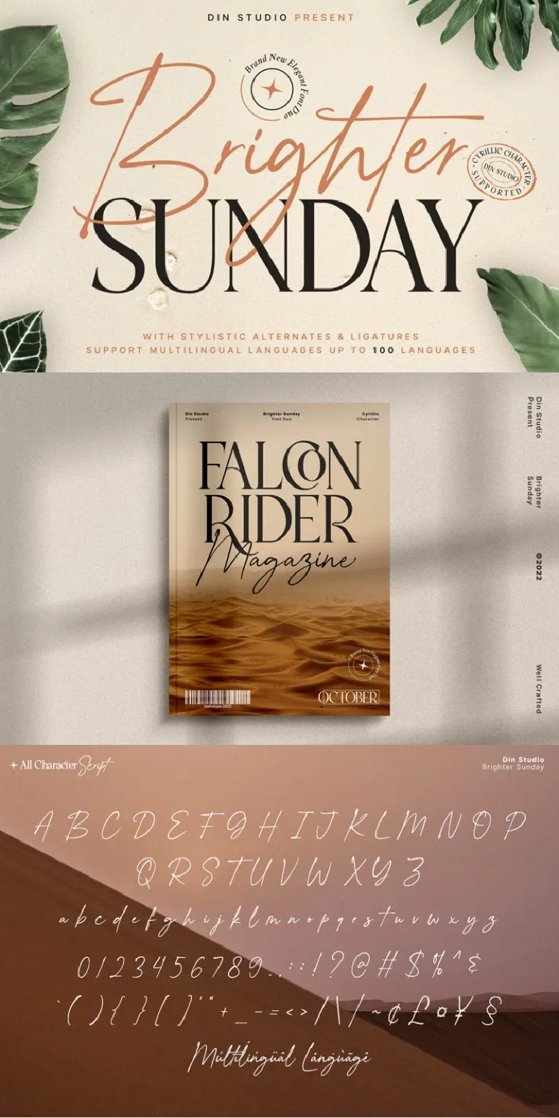 Brighter Sunday is a duo font mixture of script and serif font from which you can either combine as a set of beauty or separate a part based on their own beautiful style. The curves and strokes resembling a handwriting style on the script expresses elegant, natural vibrations. In addition, the serif style weights will leave strong, modern impressions to all of your designs.