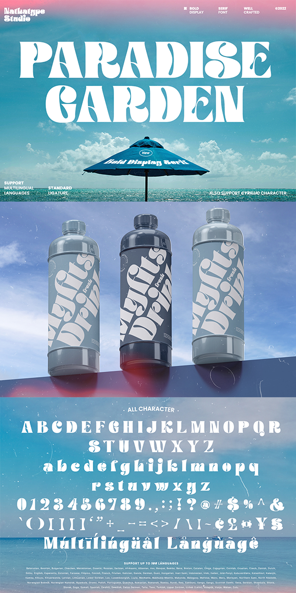 Paradise Garden is a serif font in thick weights and round shapes. Due to the weight and shape, this font expresses cute, friendly impressions on your designs. Its main characters are first, the noticeable differences between the thick and the thin lines and second, vertical and horizontal hooks or little wipes on the edges of each letter. It is better applied for big texts for a legibility purpose.