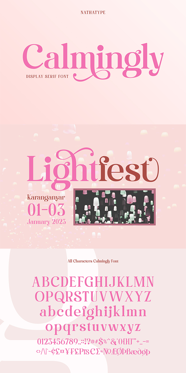 Calmingly is an elegant display serif font suitably applied to express charmingly aesthetic designs and to give more feminim touches to any of your designs. Its simple designs and letter height and line thickness variations make this font legible. Additionally, another characteristic of this font is the curvy letter edges added to some of the letters. Enjoy Calmingly’s lovely features to beautify your designs.