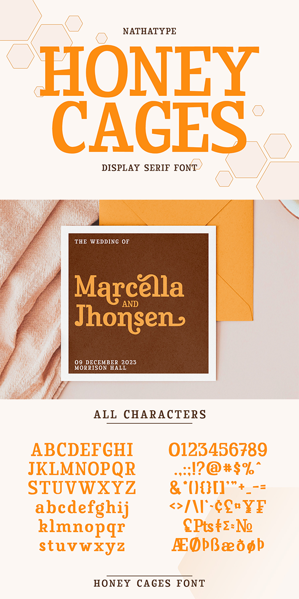 Honey Cages is a lovely display serif font in thick weights to show friendly, expressive, motional, balanced nuances between functionality and creativity. Generally, the letter shapes are round with consistent heights and wide spaces. There are also curved wipes on some of the letters’ edges to add decorative styles. Use Honey Cages for big-sized texts for a legibility reason. This font comes with some lovely features for you to enjoy.