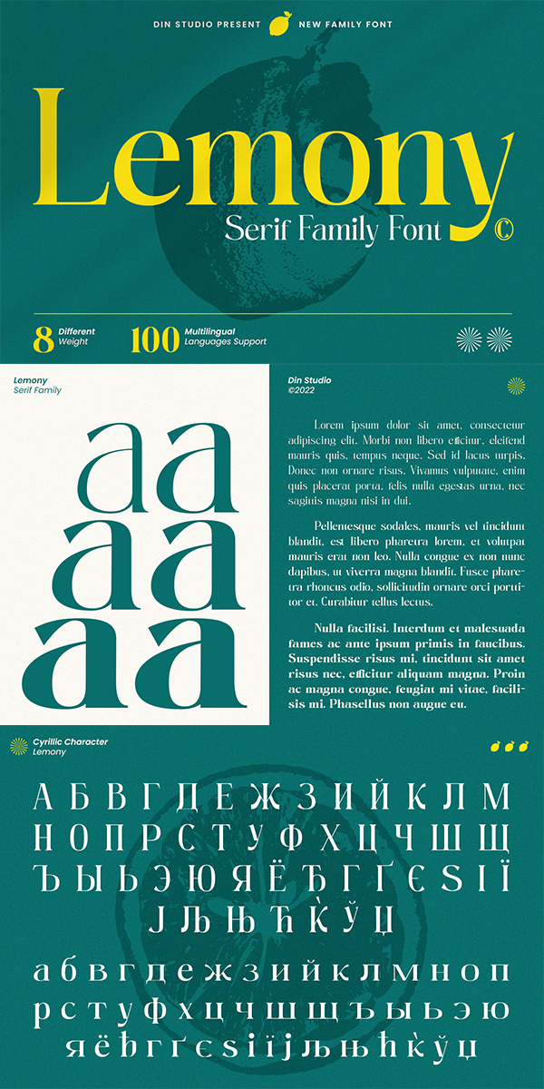 Lemony is a serif font family in 8 different volume options expressing formality and elegance in your designs. Its family character is that it has small lines in horizontal or vertical forms on the letter body, easing readers to read the letter as the lines guide readers’ attention to the reading directions. As a result, you may use this font on any text sizes. In addition to the font weight variations, you will have freedom of how and where you should use the font.