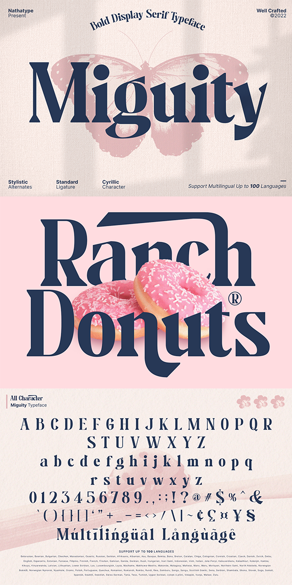 Miguity is a display serif font in thick volumes designed to leave professional, formal, lovely impressions. This font’s character is the hook on the final corners of each letter. Plus, some of the letters show swinging wipes on their edges. It surely eases the eyes to explore the text to add its readability.