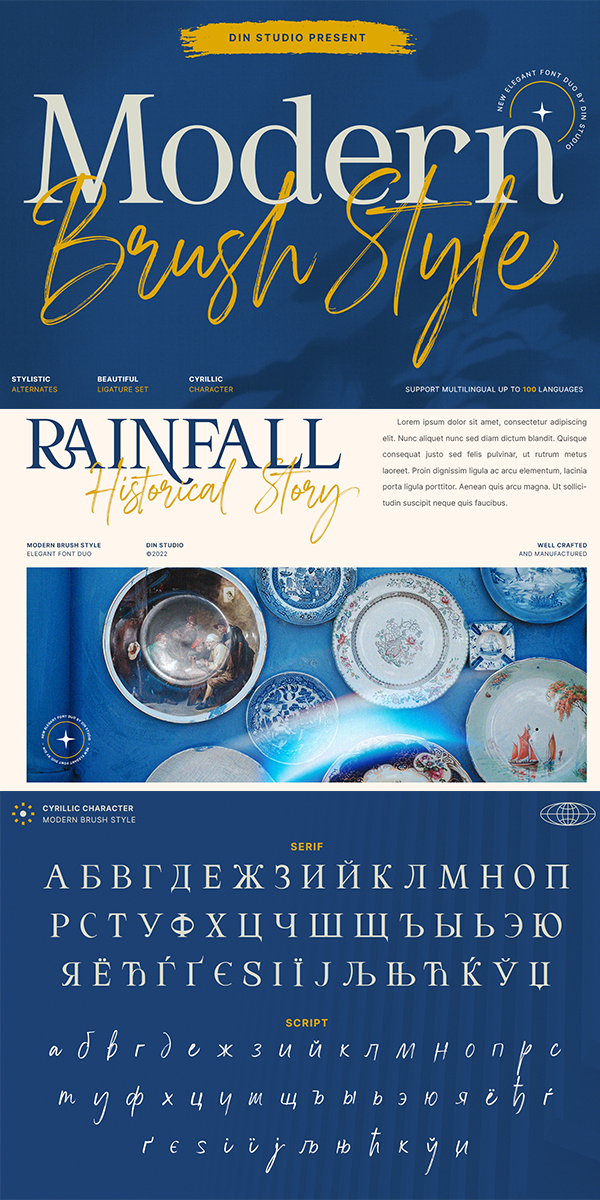 Modern Brush Style is a font duo combinations of serif and script font to express modern, elegant impressions in your designs. The serif font is characterized by scratches or hooks connecting the letters. On the other hand, script font is designed in brush styles of which letters are interconnected looking similar to a curve writing. You can use this font mixture as a beautiful set or separately as their own lovely characters. Additionally, this font duo has some unique features to enable you to maximize your designs.