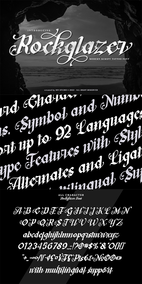 Rockglazer fits for various design projects, such as posters, banners, logos, magazine covers, quotes, greeting cards, printed products, merchandise, social media, etc. Find out more ways to use this font by taking a look at the font preview.