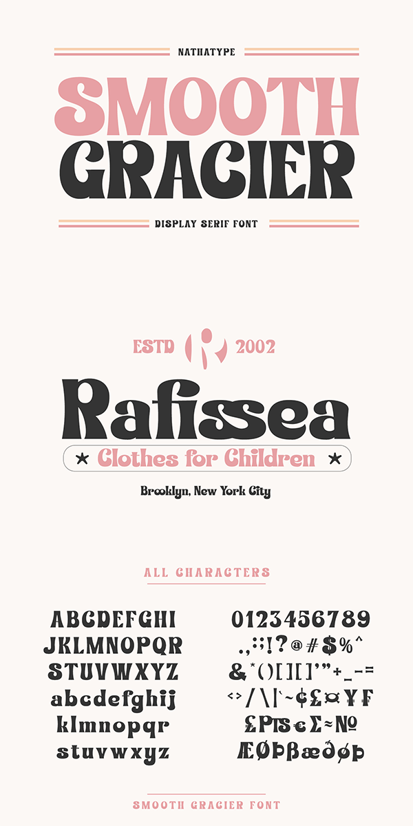 Smooth Gracier is a stylish display serif font to express modern, friendly, fun nuances on your designs. The unique geometry details and the contrast sketch lines help to make the font visually interesting. It is suitable to apply for bigger sized-texts due to its dramatic, bold styles. Enjoy the lovely features available in this font.