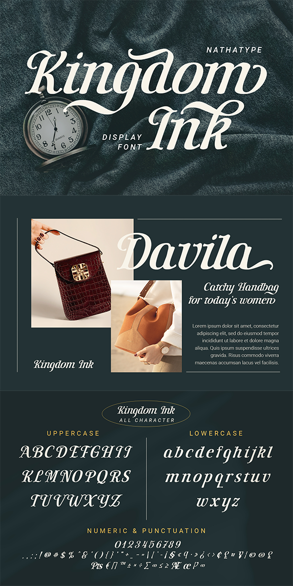 This is Kingdom Ink, a display font carefully crafted by our professional designers for the highest quality font. Its bold, prominent characters are perfect to add effects and certain characters to your designs. In addition, the professional, outstanding appearances of this font convey that it will leave amazing impressions to your audience. Some of the letters have swinging end wipes to look visually interesting. On the other hand, its aesthetic, low contrast shapes are inapplicable for small text sizes. Furthermore, you can enjoy the available features here.)