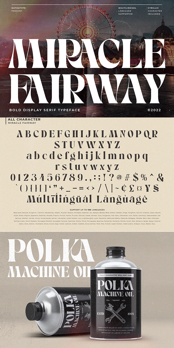Miracle Fairway is a display serif font in a thick weight design with which you can create elegant, modern, interesting designs full of fun energy. The letters’ proportions and the high contrasts are at the same level for a great legibility reason to make this font applicable to any text sizes. You may also enjoy various features available in this font.