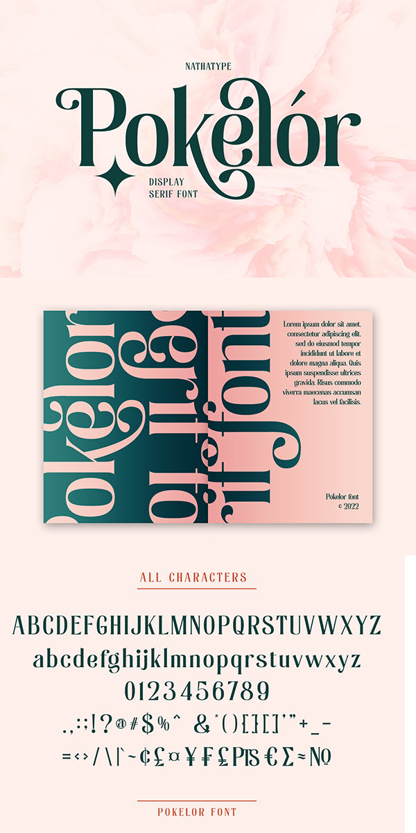 Pokelor is a display serif font beautifully designed with harmony between function and beauty showing you elegant, modern yet less formal impressions. The little hooks’ continuity elements help the eyes to keep flowing from one letter to another. With wide spaces and easily noticeable letters, this font is truly legible with which you can apply for any text sizes. Furthermore, enjoy the interesting features available in this font.