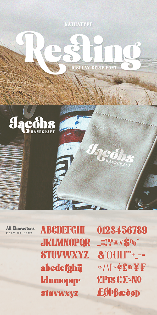 Resting is a perfect display serif font for any of your design projects. Serif font is a font type with sticky small lines on the letters’ edges expressing formal, classic nuances and more aesthetic, creative touches due to the display font combinations. This display font has thick, high contrast lines perfect for catching attention and creating firm impressions. In addition, use this font for big text sizes for a legibility reason and make use of the other interesting features to beautify your designs.