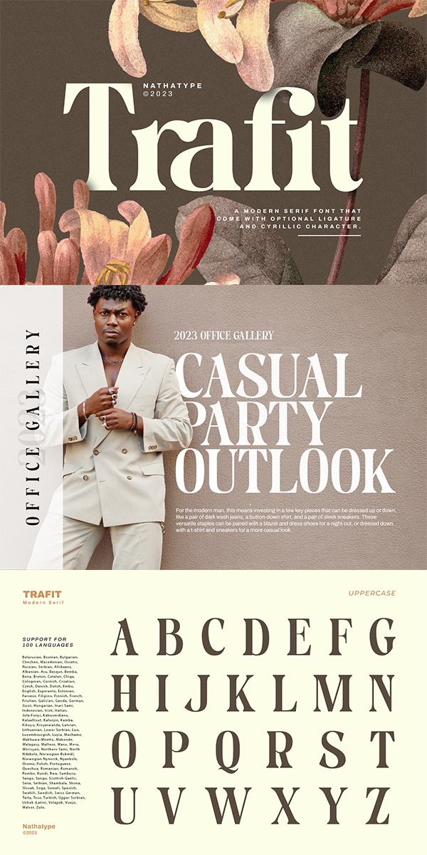This is Trafit, a perfect font to show luxury, class, and eternity. Trafit is an outstandingly designed stylish serif font. Its soft, clean lines and indentations show elegant impressions for your prominent designs. Its letter edges have hooks like the other serif fonts. The simple shapes and even sizes help to make it legible. Due to the great legibility, this font is applicable for any text sizes and length. In addition, you can enjoy the features available here.)