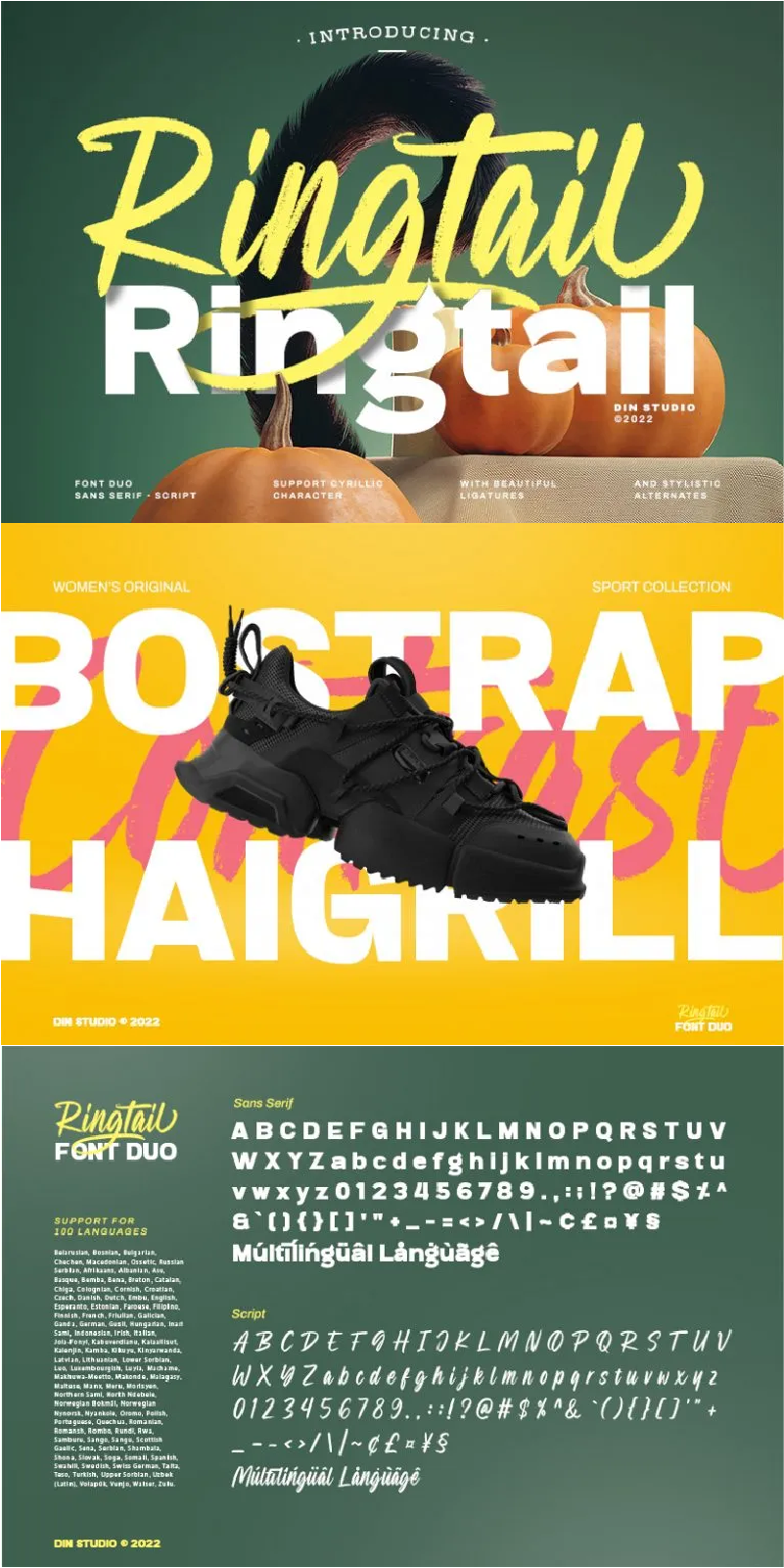 Ringtail is a font containing two font types to use together or separately: sans serif and script fonts. Sans serif font has firm, modern, simple looking lines without curvy edges. Meanwhile, the script font has curvy lines in water paint or ink textures. The textures are extra lines added to each letter and to the background letter patterns. A textured script font looks more artistic and more detailed than the other ordinary script fonts to show elegant, romantic impressions in your designs. Additionally, script font can be applied for adding extra visual contrasts to designs with sans serif font.