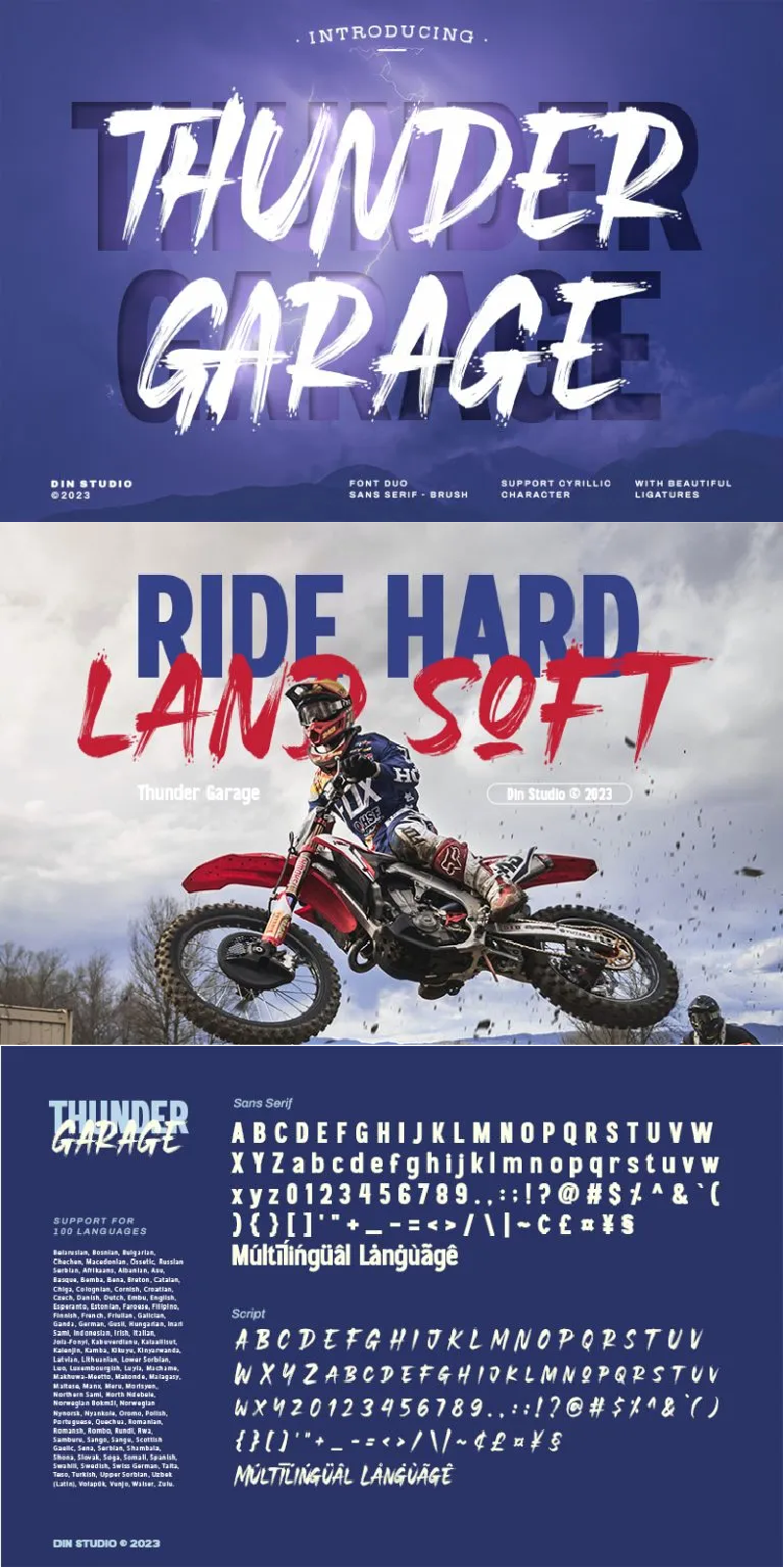 Thunder Garage is a duo font combination between brush and sans serif fonts which you use together in one design. Each font is beautifully created to support one another perfectly. Using a duo font gives interesting contrast and visual variations to your designs. The brush font is made similar to a handwriting style with brush details to show you personal, informal impressions.