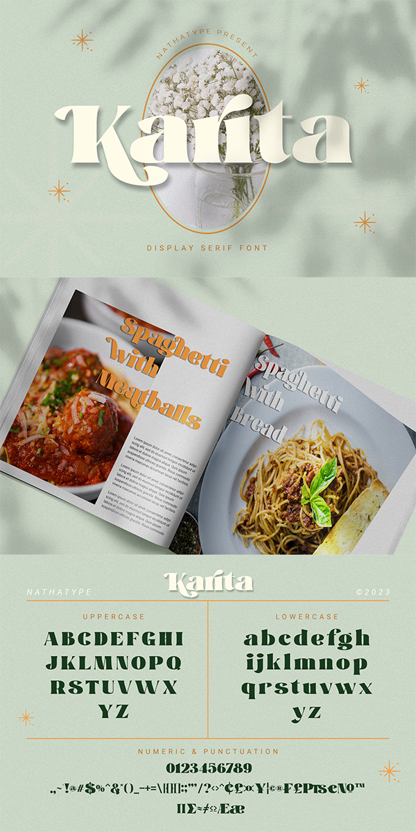 Karita fits best for various design projects, such as brandings, posters, banners, headings, magazine covers, quotes, invitations, name cards, printed products, merchandise, social media, etc. Find out more ways to use this font by taking a look at the font preview.