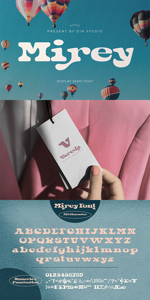Mirey is a display serif font in thick weights with small lines on the letters’ edges to look formal and classic. In addition, it expresses unique, artistic touches from its combinations with display font characters. This display font has thick lines and strong contrasts, so that it is perfect to attract attention and to show strong impressions. Due to its high legibility level, this font is applicable for a variety of text sizes. In addition, you can enjoy the available features here.
