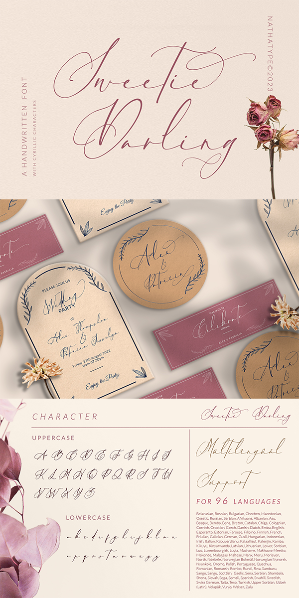 Sweetie Darling is a cursive-style handwriting script font. Like other cursive font designs, the letters are interconnected, but another character of this font is that the letters have high contrasts in curved edges to beautify the display. Due to the seemingly complex font style details to add the font’s legibility, it is suggested to apply this font for big text sizes. Additionally, you can enjoy the available features here.
