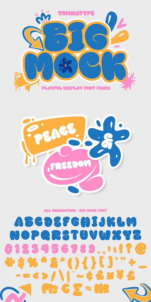 Big Mock is a display font with strong characters and unique styles to assist you to pop up your messages easily. It exists in uppercases and thick weights to show bold, prominent displays. The similar letters’ proportions and the low contrasts will affect the legibility rates. You can use such a font for big text sizes to be greatly legible. Big Mock gives you an extra clipart as a bonus. You can also make use of the available features here.