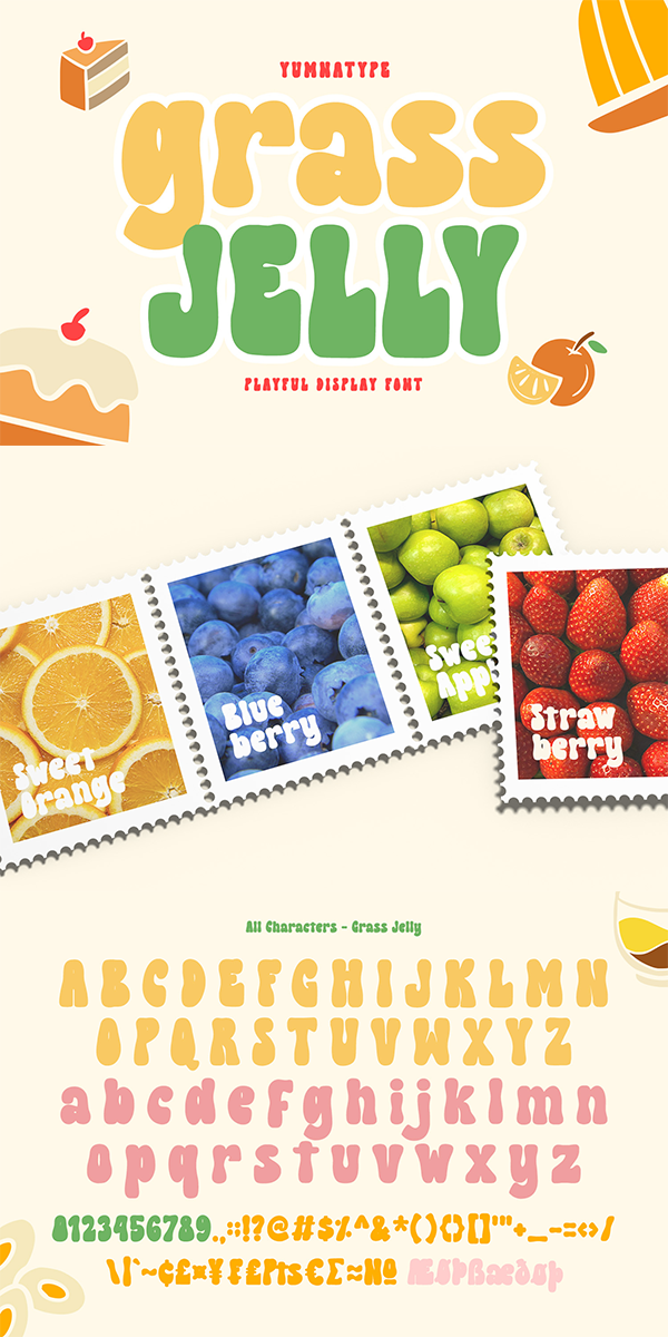 Are you looking for a firm, prominent font for your design? Have a try on our unique, eye-catching display font. This is Grass Jelly, a somewhat circled display font to produce artistic, creative, fun nuances. It has thick, strong contrast lines to attract attention and to leave a strong impression for big text sizes to be easily legible. In addition, you can enjoy the available features here.
