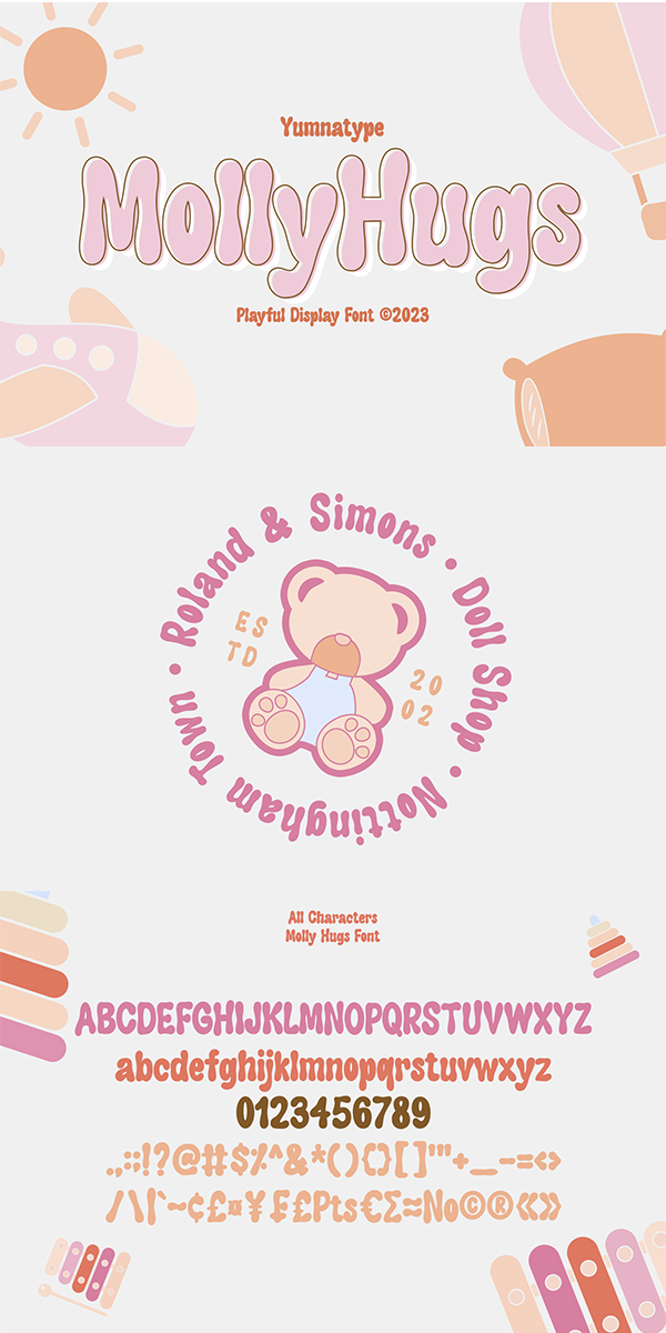 Molly Hugs fits for various design projects, such as posters, banners, logos, magazine covers, quotes, headings, printed products, invitations, name cards, merchandise, social media, etc. Find out more ways to use this font by taking a look at the font preview.