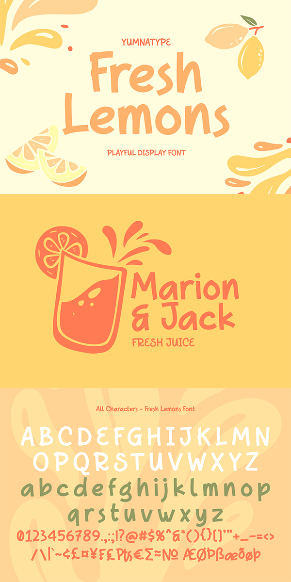 Fresh Lemons fits best for various design projects, such as brandings, posters, banners, headings, magazine covers, quotes, invitations, name cards, printed products, merchandise, social media, etc. Find out more ways to use this font by taking a look at the font preview.