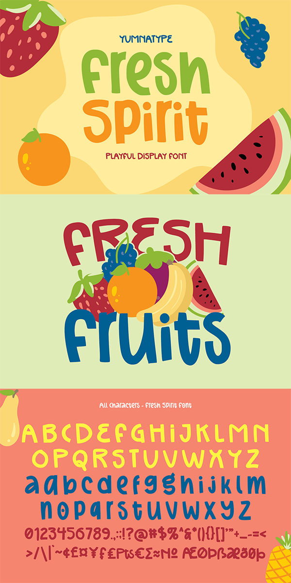 Fresh Spirit is a unique display font in round, twisting styles on the letters’ edges. It is very suitable to apply for products related to food and drink especially fruit due to its fun, cute characteristics. Fresh Spirit font, which provides a clipart in line with the theme as a bonus, will create some soft, fun, adorable nuances and increase visual attractiveness to your designs. In addition, you can enjoy the available features here.
