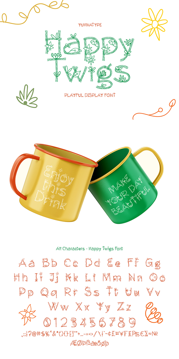 Happy Twigs fits best for various design projects, such as brandings, headings, magazine covers, quotes, printed products, merchandise, social media, etc. Find out more ways to use this font by taking a look at the font preview.