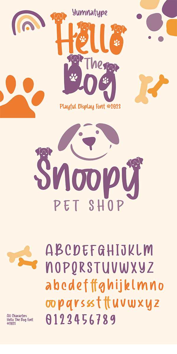 Hello the Dog is a display font with cute, charming characters inspired by a dog theme. All of its letters and characters are created in a cute way that portrays a dog’s characteristics, such as long ears, big eyes, and a cute nose. It has various sizes and variations ranging from uppercases for title displays and lower cases for softer text displays. Hello the Dog font, of which available features and a clipart bonus you can enjoy, will live up and charm your designs in order to attract the audience with the theme you have. In fact, it will also help you build up your brand identity to be unique and memorable, particularly brands related to dogs or pets.