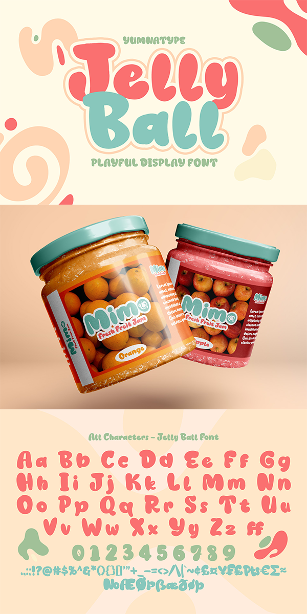 Jelly Ball fits best for various design projects, such as brandings, posters, banners, headings, magazine covers, quotes, invitations, name cards, printed products, merchandise, social media, etc. Find out more ways to use this font by taking a look at the font preview.