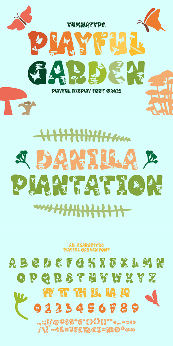 Playful Garden is a display font inspired by garden plants, such as flowers, leaves, and other plants. The letters are round and organic portraying natural shapes of garden views. This font’s unique characteristic is that all of the letters are in capitals to show dramatic, prominent displays. Such big letter sizes help emphasize the messages delivered.