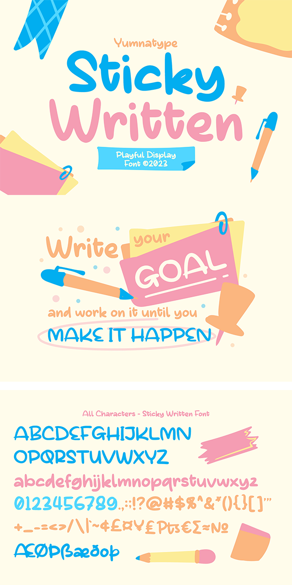 Sticky Written is a round, soft display font expressing funny, cute, fun nuances in every design. The letters look like soap bubbles flying around in the air in flowing shapes and balanced proportions. The Sticky Written font will live up and charm your designs in order to suggest positive and cute vibes to your target audience. You can apply this font, which provides a clipart as a bonus, for big text sizes to make it more legible and attractive. In addition, you can make use of some available features here.)