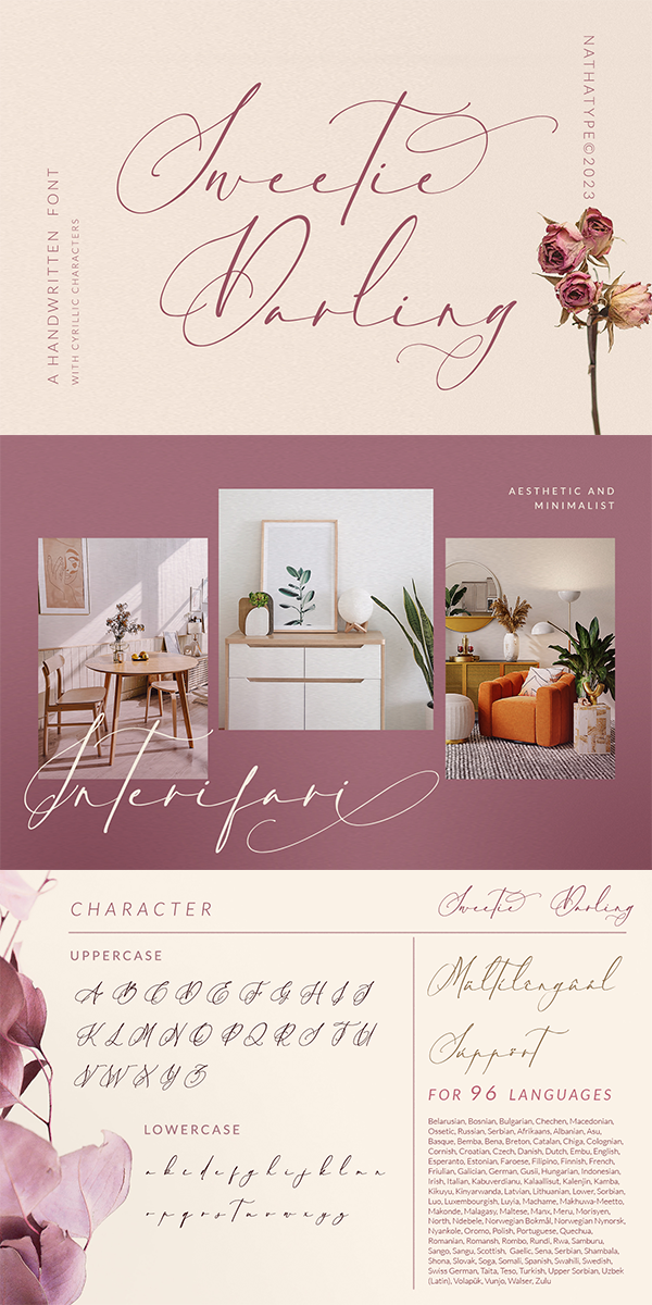 Sweetie Darling is a cursive-style handwriting script font. Like other cursive font designs, the letters are interconnected, but another character of this font is that the letters have high contrasts in curved edges to beautify the display. Due to the seemingly complex font style details to add the font’s legibility, it is suggested to apply this font for big text sizes. Additionally, you can enjoy the available features here.