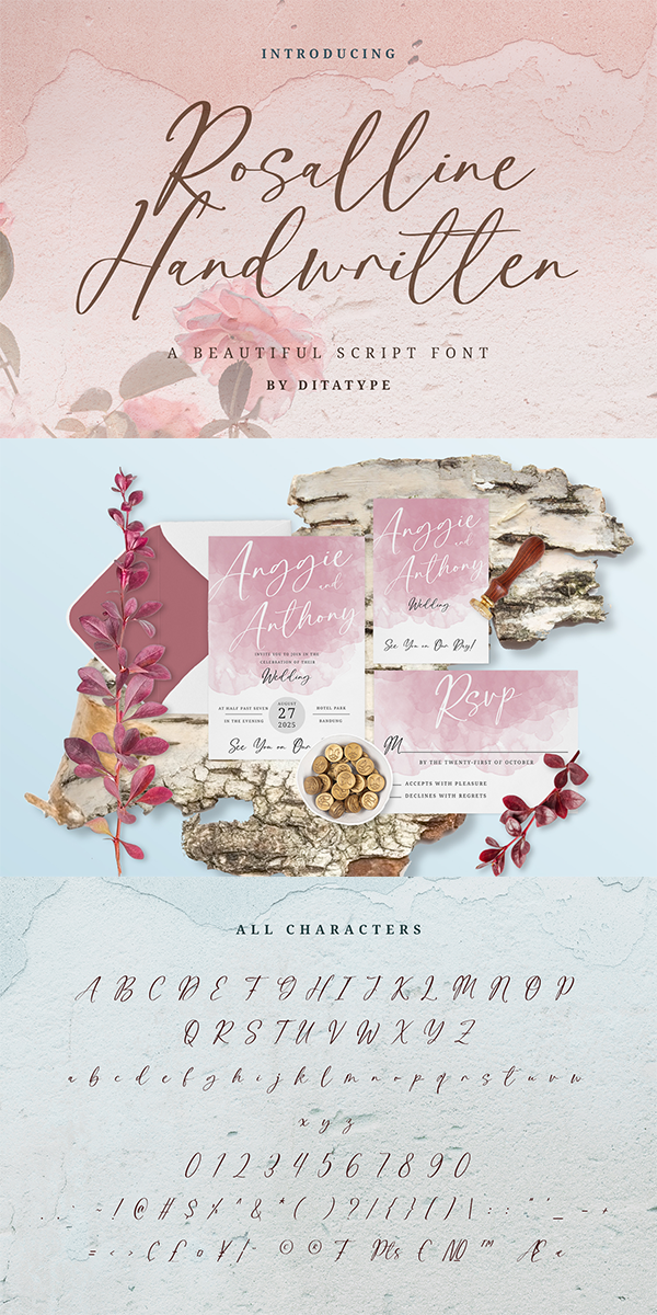 Rossaline Handwritten fits best for various design projects, such as brandings, quotes, invitations, name cards, greeting cards, printed products, merchandise, social media, etc. Find out more ways to use this font by taking a look at the font preview.