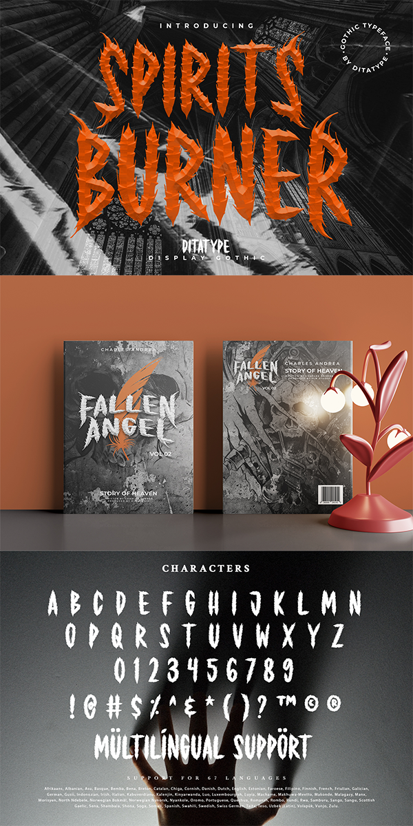 Spirit Burner is a gothic-themed display font combining the gothic characteristics with uneven edge lines and unique details to show firm, lovely, dramatic impressions. The letter shapes follow the gothic characteristics with uneven soft lines and unique details such as ornaments and decorations to add uniqueness to the design.