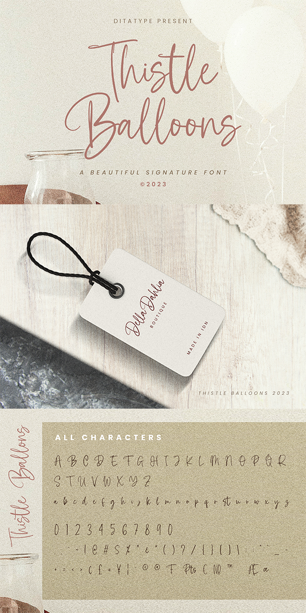 Thistle Balloons fits best for various design projects, such as brandings, quotes, invitations, name cards, greeting cards, printed products, merchandise, social media, etc. Find out more ways to use this font by taking a look at the font preview.