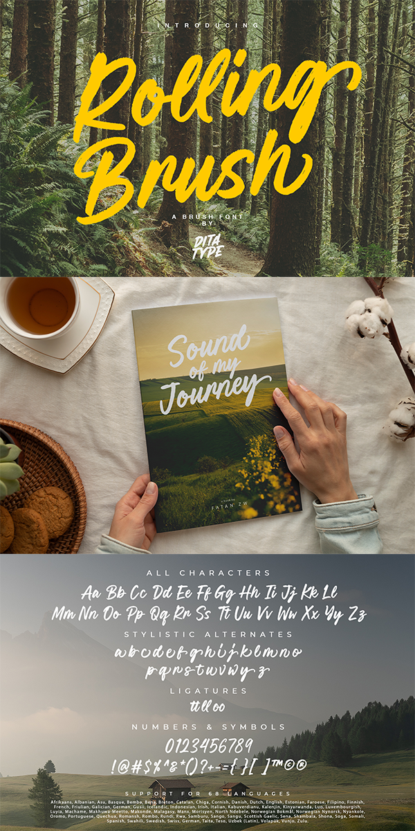 Rolling Brush is suitable for any designs that want to convey a warm, personal and alluring impression. You can use this font in the design of greeting cards, invitations, logos, labels, and many other design projects that want to create uniqueness through a natural, handwritten touch. Find out more ways to use this font by taking a look at the font preview.