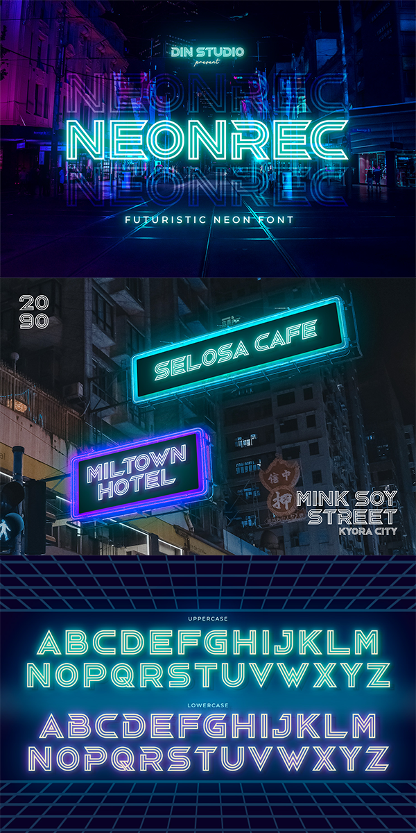 Neonrec is an innovative display font that merges futuristic aesthetics with the mesmerizing allure of neon lights. With its bold uppercase letterforms and a luminous neon backlight, this typeface commands attention, creating a visually stunning and forward-thinking experience. The special characteristic of this font lies in the sleek and cutting-edge design, embodying the essence of a futuristic world. Each letter is meticulously crafted with precision and sharp lines, exuding a sense of technological advancement and modernity. The neon backlight adds a striking visual element that elevates the font to new heights. Inspired by the captivating glow of neon lights, Neonrec infuses a sense of energy and innovation into each character. The luminous backlight creates a radiant glow that casts a captivating hue, reminiscent of the neon signs that adorn the streets of a futuristic metropolis. This futuristic neon effect adds depth and dimension to the font, creating an eye-catching visual impact.