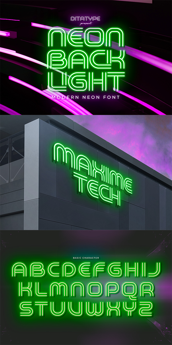 Neon Backlight thrives in designs that embrace a dynamic and vibrant style. Whether you’re creating posters, signage, logos, or digital artwork, this font will add a dazzling element that sets your project apart. It particularly shines in applications related to nightlife, entertainment, fashion, and retro-themed designs.