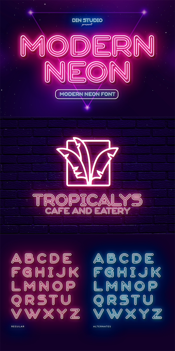 Modern Neon is an audacious display font that combines the allure of neon lights with an array of captivating lines. With its uppercase letterforms, this typeface commands attention, creating a visually stunning experience that leaves a lasting impression. The defining feature of Modern Neon lies in its bold and adventurous lines that adorn each letter. These radiant lines flow dynamically throughout the characters, adding an element of complexity and intrigue. The interplay of these luminous lines creates a visual spectacle, captivating the viewer’s gaze and drawing them into a world of electrifying typography. Inspired by the vibrant glow of neon signs, Modern Neon exudes a futuristic energy. The font’s luminosity casts a vivid hue, evoking a sense of innovation and modernity. Each letter pulsates with an otherworldly glow, creating a striking visual impact that cannot be ignored. Each letter of this font has been meticulously crafted to strike a balance between legibility and decorative intricacy. The interconnected lines add depth and movement to the characters, enhancing the overall composition without compromising readability. The result is a font that exudes creativity and boldness while ensuring your message remains clear and impactful. You can also enjoy the various features available in this font. Enjoy the various features available in this font.