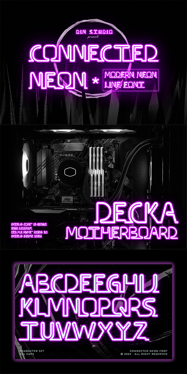 Connected Neon is a mesmerizing display font that encapsulates the vibrant glow of neon lights, fusing it with a unique twist of connected letterforms. With its bold and uppercases design, this typeface commands attention, drawing the viewer into a captivating visual experience. The defining feature of Connected Neon lies in its elegant lines that seamlessly connect each letter, creating a unified and harmonious composition. These delicate lines flow effortlessly from one character to the next, accentuating the connectivity between them. As a result, the letters appear to dance with an electric energy, forming an enchanting tapestry of illuminated artistry. The neon-inspired style of Connected Neon is a nod to the retro-futuristic aesthetics of the 80s, reminiscent of the vibrant signage that adorned the bustling city streets. The font’s luminous glow radiates with an otherworldly aura, casting a vivid hue that is both nostalgic and contemporary, evoking a sense of vibrant energy and modernity. Each character in Connected Neon has been meticulously crafted to strike the perfect balance between legibility and decorative flair. The bold letterforms boast a sleek, sans-serif design, ensuring clarity even in the midst of the dynamic interplay of lines. The seamless connections between letters create a sense of continuity and fluidity, enhancing the visual appeal without compromising readability. Enjoy the various features available in this font.