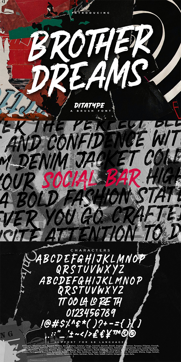 Brother Dreams is a captivating brush font that exudes a raw and artistic vibe. With its bold capitalized letterforms and ragged edges, this typeface brings a unique and rebellious touch to your designs. The defining feature of Brother Dreams lies in its rugged and ragged edges, giving the font a handcrafted and slightly distressed appearance. This font is designed with expressive brush strokes, capturing the essence of brush calligraphy. The bold capitalized letterforms command attention, making a powerful statement with their unconventional and untamed style. Inspired by the untamed spirit of artistic expression, Brother Dreams embodies a sense of creativity and authenticity. The rough and ragged edges add a touch of uniqueness and individuality to each letter, as if they were painted with passion and emotion. This font embraces imperfection and celebrates the beauty of artistic spontaneity. Each letter of Brother Dreams is meticulously crafted to maintain its boldness and legibility while embracing the rugged and ragged edges. The resulting composition is a balance of artistic expression and readability. This font allows your message to stand out with its raw energy and rebellious charm. Enjoy the various features available in this font.