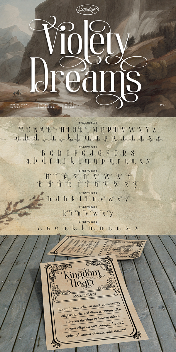 Violety Dreams is a serene and elegant serif font that will transport your designs to a realm of beauty and sophistication. With its timeless letterforms and delicate swinging strokes on select letters, this typeface evokes a sense of tranquility and grace. This serif uniqueness in its graceful swinging strokes, which adorn certain letters, adding a touch of whimsy and charm. These elegant extensions create a sense of movement and fluidity, capturing the essence of grace and elegance. Inspired by the ethereal nature of dreams and the delicate beauty of violet flowers, Violety Dreams embodies a sense of tranquility and enchantment. The serif letterforms are meticulously crafted to exude elegance and sophistication, while the swinging strokes add a unique touch of whimsicality. This font strikes a perfect balance between classic charm and imaginative flair. The letterforms are designed with precision and clarity, ensuring legibility and readability. Each letter retains its distinctive shape, while the swinging strokes create a visual interest and draw the eye. You can use it in big text sizes to be greatly legible and enjoy the available features here.