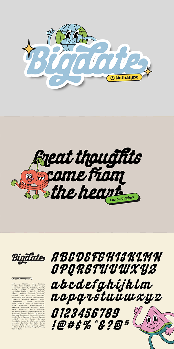 Bigdate is a captivating display font that features connected letters, a bold weight, and low contrast. With its unique design, this typeface brings a sense of fluidity and elegance to your creative projects. The connected letters of this font create a seamless flow between characters, forming a cohesive and visually captivating composition. Each letter effortlessly connects to the next, resulting in a continuous and harmonious appearance. This feature adds a touch of sophistication and uniqueness to the font, making it stand out from conventional display typefaces. With a bold weight, Bigdate commands attention and makes a bold statement in your designs. The thick strokes give the font a strong presence and ensure high visibility. The boldness of the letters adds an element of impact and intensity to your typographic compositions. It features low contrast, allowing for a balanced and uniform visual experience. The consistent stroke width throughout the font creates a harmonious and pleasing aesthetic. For the best legibility you can use it in the bigger text. Enjoy the available features here.