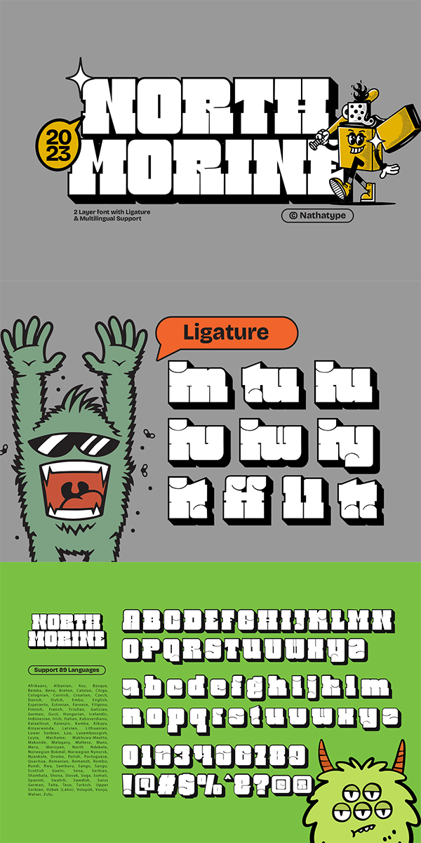 North Morine is a powerful display font that offers both regular and shadow extrude styles, designed with a very thick weight and very low contrast. With its commanding presence and distinct design, this typeface adds a bold and striking touch to your creative projects. The very thick weight of this font demands attention and exudes strength. Each letter is solid and substantial, making a powerful statement in any composition. The thick strokes create a bold and impactful visual experience, ensuring your message stands out with confidence. With very low contrast, it emphasizes uniformity and consistency. The subtle differences in stroke width across the letters maintain a balanced and harmonious aesthetic. This design choice influences the legibility and readability, so it will be better if you use it in bigger text. North Morine offers both regular and shadow extrude styles, providing versatility and visual interest to your designs. The regular style showcases the font’s bold weight and low contrast, making it perfect for grabbing attention. The shadow extrude style adds depth and dimension, creating a three-dimensional effect that adds a touch of drama to your designs. Enjoy the available features here.