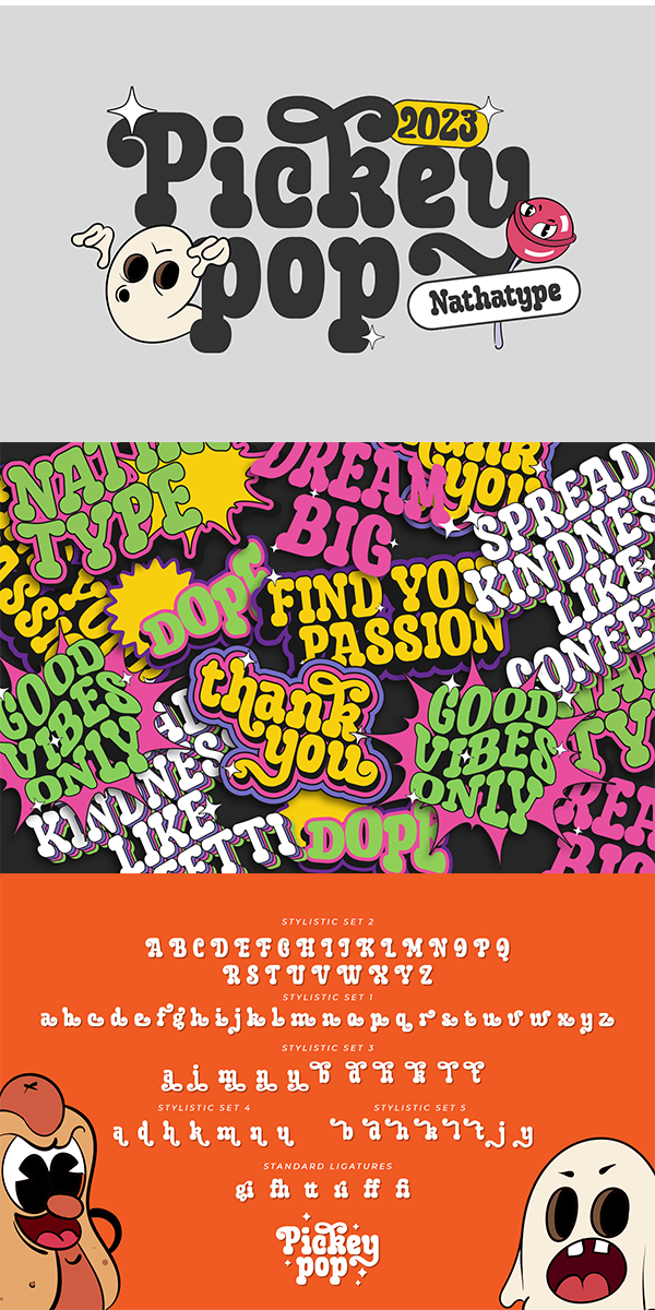 Pickey Pop is a delightful display font that combines a thick weight, low contrast letters, and charming swinging endings. With its playful and bold design, this typeface brings a sense of joy and vibrancy to any creative project. The thick weight of this font adds a strong and confident presence to each letter. The boldness of the strokes creates visual impact and ensures legibility even at smaller sizes. This display font demands attention and stands out effortlessly in any design composition. In contrast to its bold weight, Pickey Pop features low contrast letters. This design choice gives the font a sense of solidity and consistency. The uniform strokes contribute to a clean and contemporary appearance, making it a versatile choice for a wide range of design applications. What makes this font truly special are the swinging endings found in select letters. These whimsical details add a touch of playful movement and uniqueness to the font. The swinging letter endings bring a sense of rhythm and energy, infusing your designs with a joyful and dynamic quality. For the best legibility you can use it in the bigger text. Enjoy the available features here.