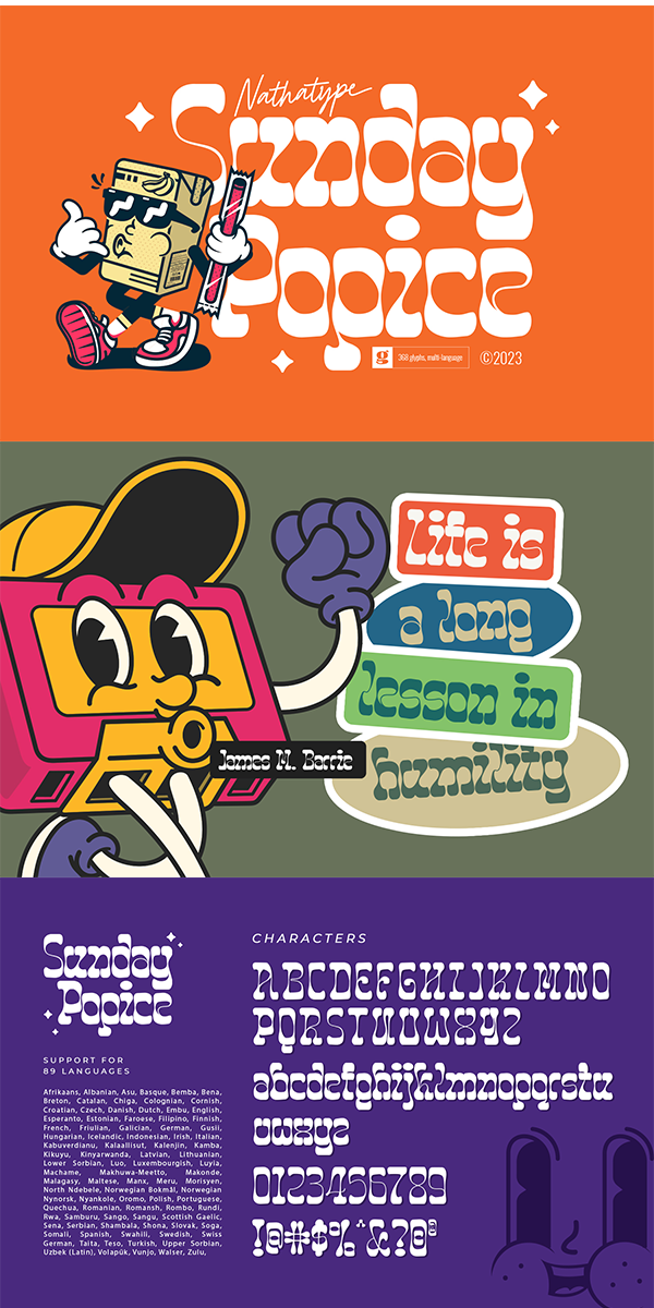 Sunday Popice is a delightful display font that brings a dose of cuteness and whimsy to your designs. With its rounded shapes and high contrast, this typeface exudes a unique charm that is perfect for adding a touch of playfulness to any project. Designed with love and attention to detail, Sunday Popice captures the essence of childlike joy and innocence. Each character is carefully crafted with rounded edges, creating a friendly and approachable appearance. The high contrast between thick and thin strokes adds a dynamic and lively quality to the font, making it truly stand out. This font’s rounded and soft shapes evoke a sense of warmth and coziness, reminiscent of a Sunday afternoon spent in the company of loved ones. Because of the unique style, for the best readability use this font at large text sizes. Enjoy the available features here.