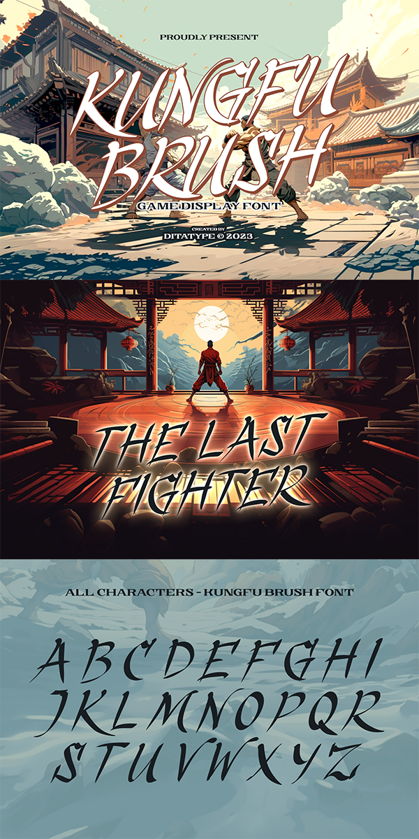 Kungfu Brush is a captivating game-themed display font designed in uppercase, infusing the essence of martial arts and the artistry of brush strokes. It features a distinct brush-style accent that brings a sense of handcrafted artistry to each letter. Inspired by the fluid movements of martial arts, the font captures the energy and elegance of brush strokes. This unique feature adds a touch of creativity and authenticity, making this font stand out from conventional display fonts. Designed with fairly low contrast, Kungfu Brush prioritizes a balanced and harmonious visual experience. The subtle differences in stroke width across the letters create a smooth and comfortable reading experience. With its uppercase design, Kungfu Brush exudes power and strength. Each letter commands attention and showcases the boldness of martial arts. The font’s uppercase style adds a sense of authority and captures the spirit of determination found in the martial arts realm. You can also enjoy the available features here.