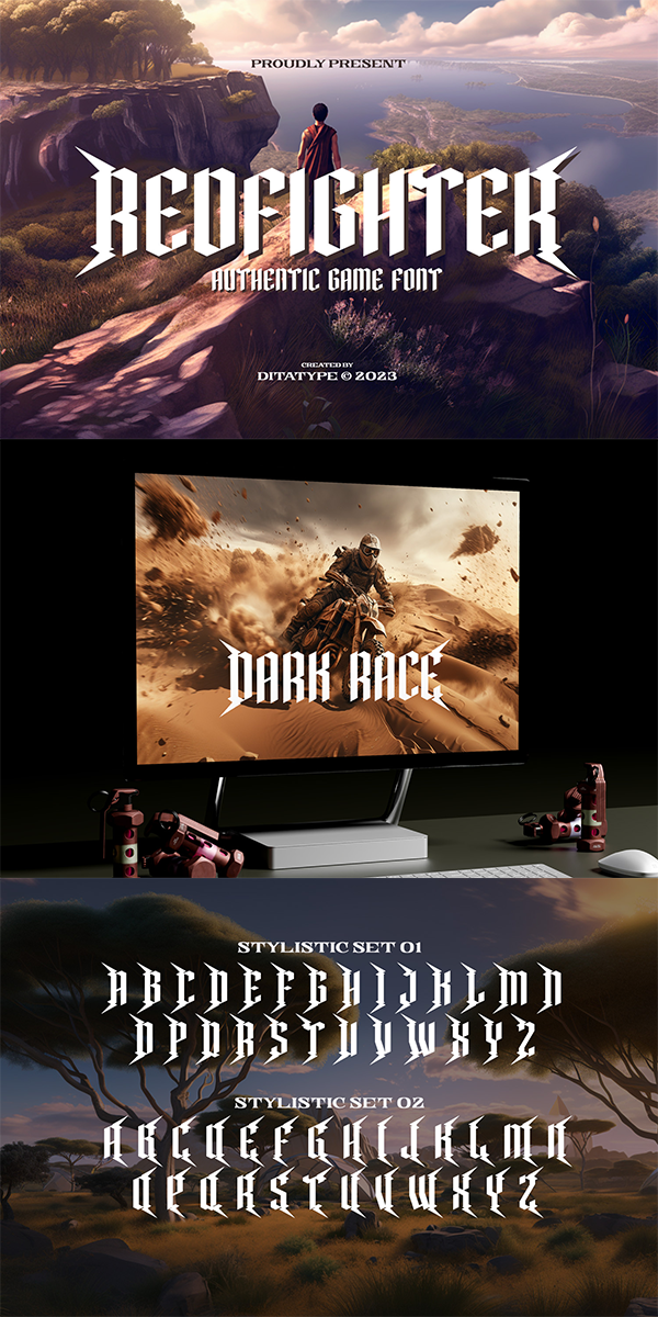 Redfighter is an attention-grabbing display font with a games theme, featuring large letters and a rectangular shape with sharp corners. This font shows large letters that demand attention and make a statement. The generous size of each character ensures maximum visibility and impactful design elements. This design choice allows this font to stand out and grab the viewer’s attention with its imposing presence. The rectangular shape with sharp corners in Redfighter adds a sense of structure and strength to the font. The clean lines and defined angles create a visually bold and striking appearance. This unique feature evokes a sense of power and precision, reflecting the intensity and competitiveness found in the gaming world. For the best legibility you can use it in the bigger text. Enjoy the available features here.